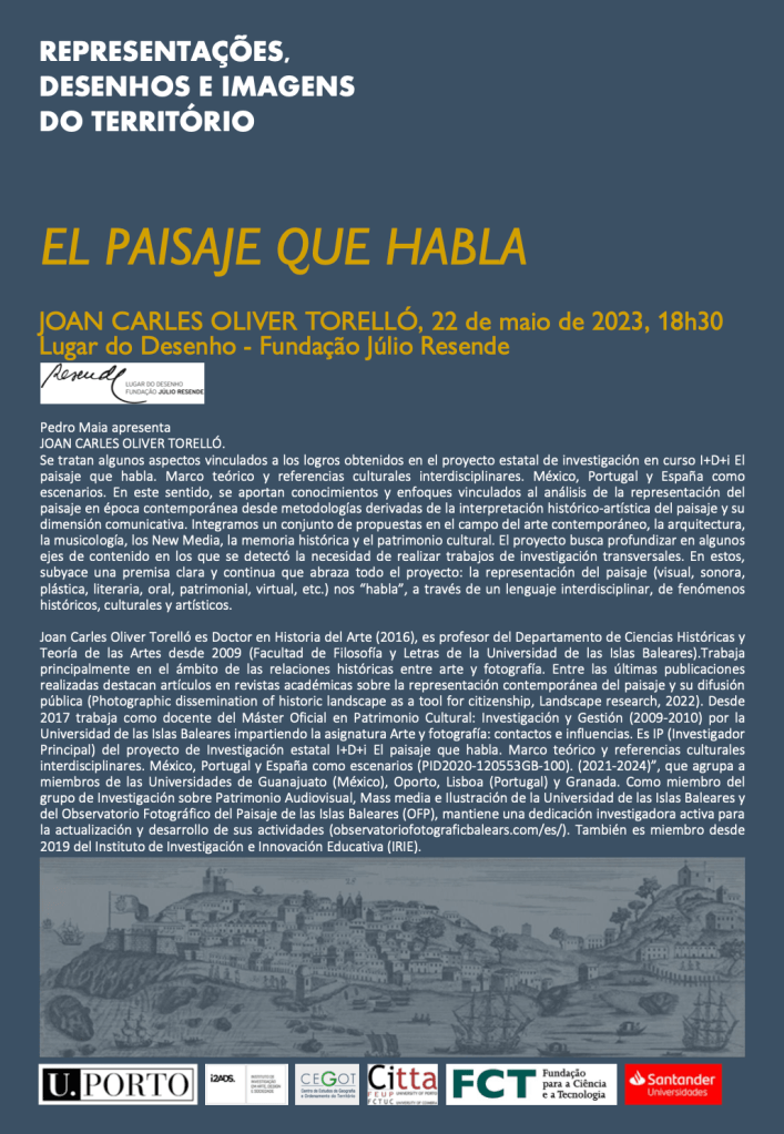 Na sua comunicação, irá abordar alguns aspectos do projecto de investigação A paisagem que fala, que referi anteriormente. Nesse sentido, irá tratar conhecimentos decorrentes da análise da representação da paisagem na época contemporânea, tais como as metodologias derivadas da interpretação histórico-artística da paisagem e a sua dimensão comunicativa. Irá integrar nesta análise um conjunto de propostas no campo da arte contemporânea, da arquitetura, da musicologia, dos New Media, da memória histórica e do patrimônio cultural, pois o projeto pretende aprofundar alguns eixos de conteúdos nos quais se identificou a necessidade de realizar trabalhos de pesquisa transversais. Neles está subjacente uma premissa clara e contínua que abraça todo o projeto: a representação da paisagem: visual, sonora, plástica, literária, oral, patrimonial, virtual, etc. que nos “fala”, através de uma linguagem interdisciplinar, de fenómenos históricos, culturais e artísticos.